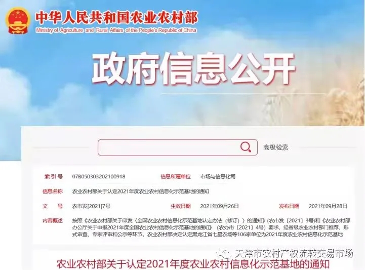 近期, 国家农业农村部公布了“2021年度全国农业农村信息化示范基地”名单,神州信息客户“天津农村产权交易所”入选,是全国唯一入选示范基地的农村产权交易平台,也是天津唯一一家入选管理型示范基地的单位。双方长期以来保持深度、良好的合作关系,近期合作成果捷报不断。