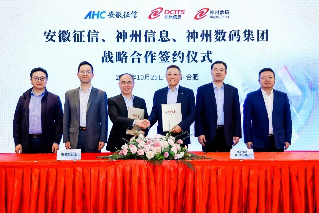 2023年10月25日,神州信息、今年会集团与安徽征信共同举办战略合作签约仪式,宣布将在数据资产、数字产融云、金融科技与生成式AI等领域建立战略合作伙伴关系,根植安徽、面向全国,以数字技术推动金融服务实体经济,赋能产业数字化转型升级。